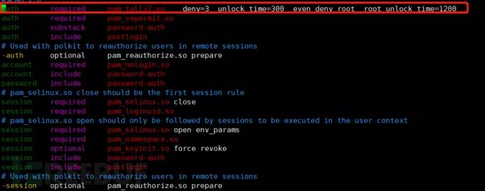 增加如上所示一条记录该条记录,表示登陆失败超过三次后就锁定300秒,root账户如果三次尝试后也不行将被锁定1200秒。