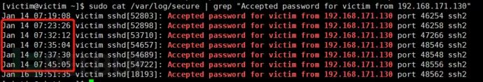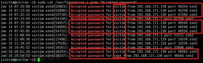 Jan 14 07:37:30 victim sshd[54689]: Accepted password for victim from 192.168.171.130 port 48548 ssh2Jan 14 07:37:30 victim sshd[54689]: pam_unix(sshd:session): session opened for user victim by (uid=0)