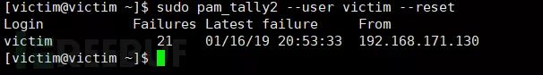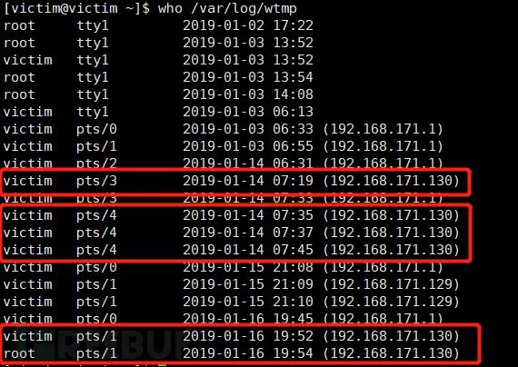 cat /var/log/secure | grep “Accepted password for victim from 192.168.171.130” 记录登陆成功的时间点然后判断是否跟暴力破解的时间段一致,如果一致则表示该账户是被爆破成功登陆。或者直接找管理员确认登陆信息是否正常。