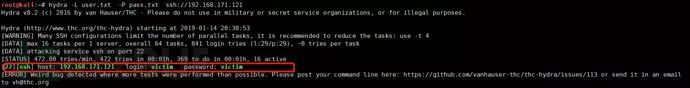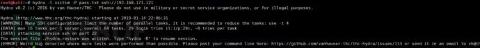 1)在命令行下使用hydra加载用户名、密码字典对目标ssh服务开展爆破行为: