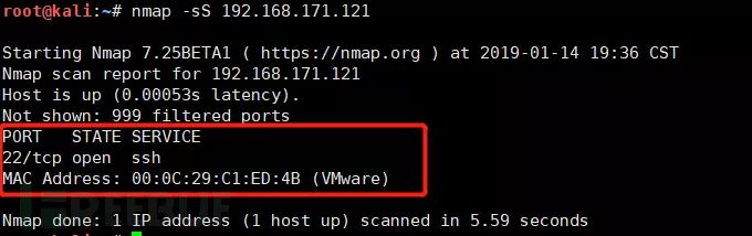1)在攻击主机的命令行下输入nmap -sS 192.168.171.121 对目标主机进行端口扫描: