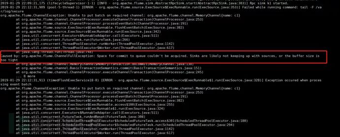 这里表示增加channels中queue的大小,默认为100,如果使用默认值,当处理大量的日志时就会发生如下报错情况。