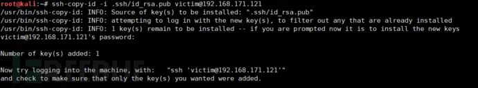 ssh-copy-id -i .ssh/id_rsa.pub victim@192.168.171.121