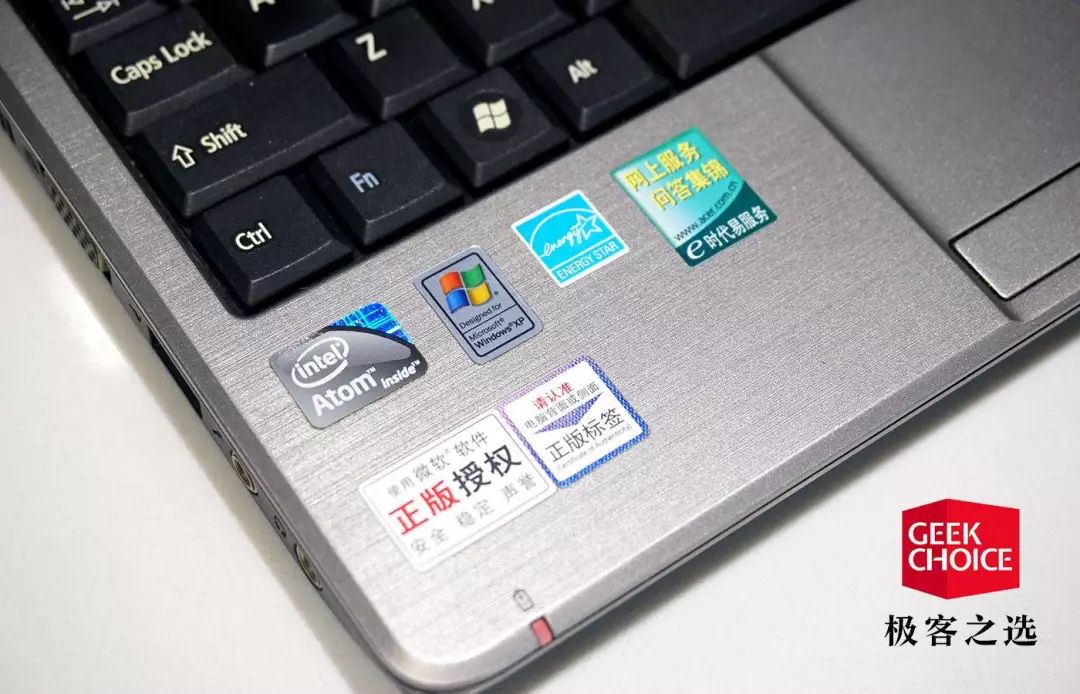 除了 C 面的布局和尺寸以外,掌托处的贴纸也很有意思,比如像正版 Windows 的贴纸、英特尔 Atom 处理器的贴纸、能源之星的贴纸等等,右侧还有上网本的一些关键特性。虽然现在的笔记本依然保留了这个传统,但是大多数只有 CPU 和显卡两个贴纸,可以说这些贴纸「矩阵」同样散发着浓浓的怀旧气息。