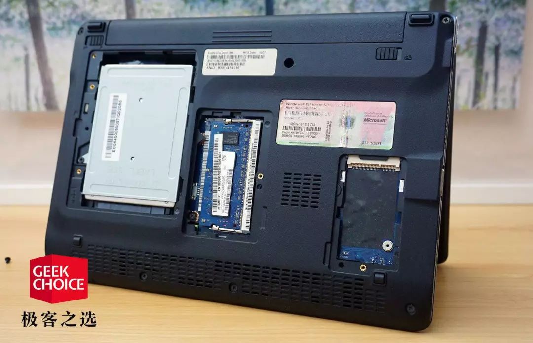 正所谓麻雀虽小五脏俱全,上网本虽然尺寸很 mini,但自己动手更换内存或者是硬盘并不是难事儿。在机器 D 面,用户可以很轻松的通过卸下螺丝来更换一些零件,不过在那时候 DDR2 的笔记本内存并没有太多选择,大容量的 2.5 英寸机械硬盘也称不上便宜,毕竟大多数消费者是因为价格上的优势才选择了上网本。