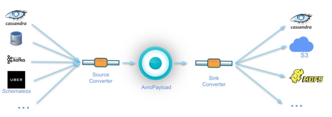 为了支持连接任何数据源和任意接收器的架构,我们要求所有摄取源将转换器定义为从自己的格式到 Avro,所有分散接收器将转换器定义为从 Avro 到本地数据模型(对于 Cassandra 来说就是 ByteBuffers)。