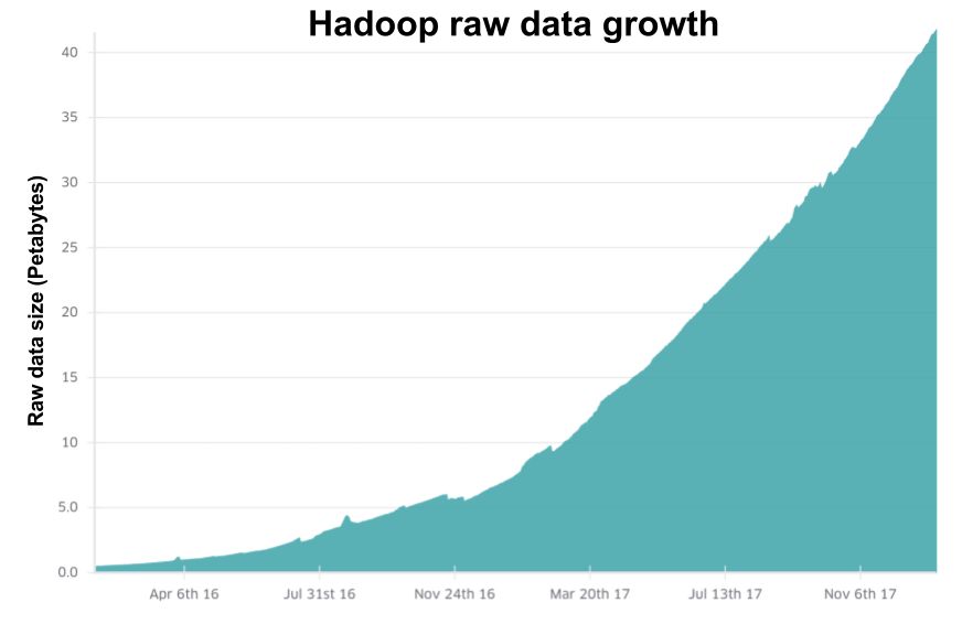 图 2:随着 Uber 继续扩展全球业务,存储在 Hadoop 数据湖中的原始数据呈指数级增长。