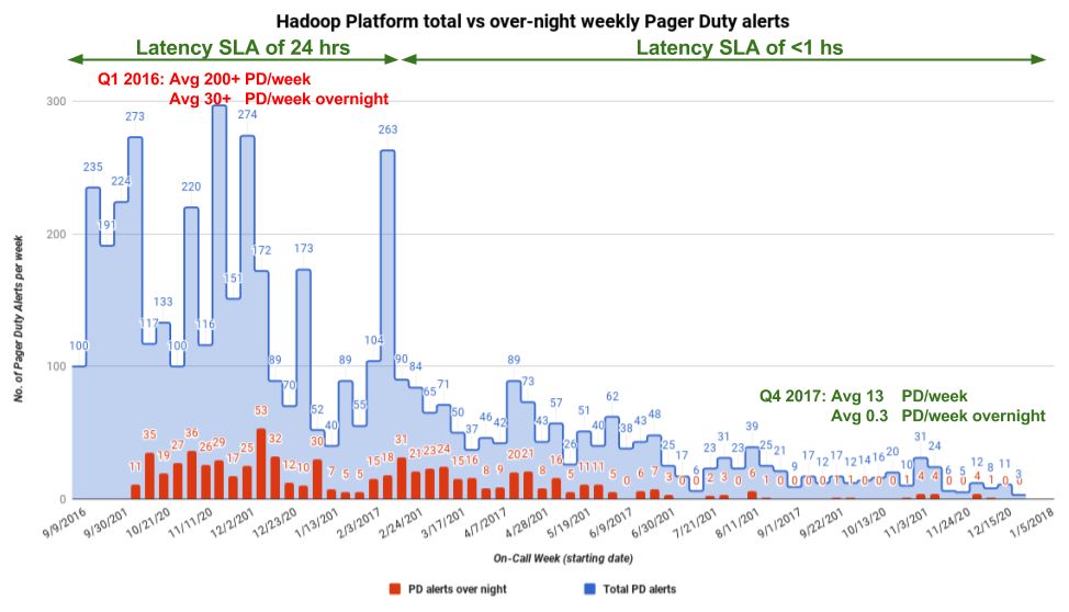 图 3:Hadoop 平台团队的轮班待命警报图表,可见维护系统需要多大的开销。