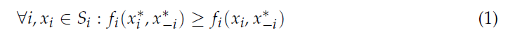 纳什均衡的正式定义如下。让 ( S, f ) 是一个有 n 个玩家的博弈,其中 Si 是给定玩家 i 的策略集。因此,由所有参与者的策略集组成的策略配置文件 S 将是,S=S1 × S2 × S3… × Sn。令 f(x)=(f1(x),…,fn(x)) 为策略集 x∈S 的支付函数。假设 xi 是参与者 i 的策略,x−i 是除参与者 i 之外的所有参与者的策略集。因此,当每个玩家 i∈1,…,n 选择策略 xi 时,策略集 x=(x1,…,xn),给特定玩家的收益 fi(x),这取决于该玩家选择的策略 (xi) 和其他玩家选择的策略 (xi-i)。如果任何单个参与者的策略单方面偏差都不会为该特定参与者带来更高的效用,则策略集 x∗∈S 处于纳什均衡[10]。正式地说,x∗ 处于纳什均衡当且仅当: