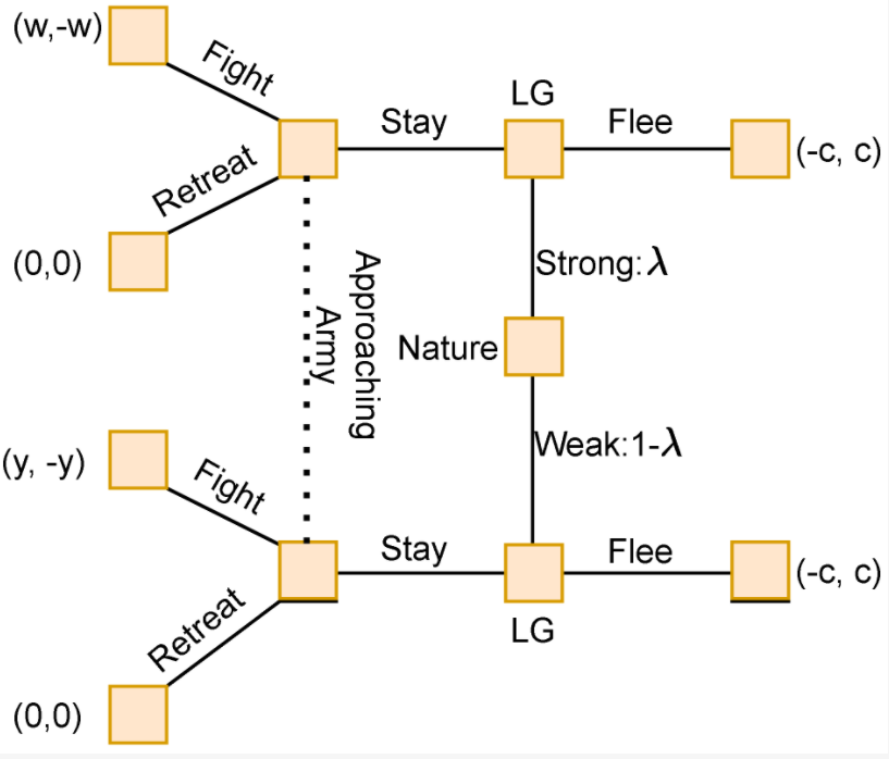 第二场比赛与第一场非常相似。在这个博弈中,一座小城由强大的诸葛亮将军守卫。他得知一支强大的敌对军队正在接近这座城市。他面临两个选择。他可以逃跑,然后他会脱离城市,很可能会被接近的军队追杀,或者他可以留下来保卫城市。如果他选择了后者,大军出手,他很可能会失去性命、军队和城市。面对这种困境,他命令他的手下隐藏起来,让城市从外面看起来空无一人。他爬到城市最重要的塔顶,演奏音乐。对方将军知道梁将军的经验和实力,怀疑将军在空城的塔楼中采取这种不起眼的位置来伏击他的军队,他们离开了城市以避免被伏击。梁将军在这里有效地发出了两个信号。首先是他的声誉,这是一个包含他的战略和军事实力的信号。第二个是他选择留下来保卫这座城市。有了这两条信息,梁将军的军队的行踪和规模就没有了,对方军队选择了零损失的安全选项,离开了。这段历史被建模为另一个两人信号博弈,如下图 3 所示: