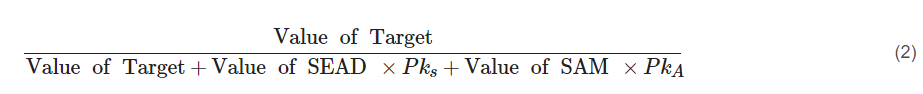为了说明这些观点,汉密尔顿将它们应用于 SEAD 和时间关键目标的标准空战博弈。在这场战斗中,“蓝方”试图消灭一些地面目标。为此,他们使用 SEAD。作为回应,“红方”将发射 SAM,这是 SEAD 难以避免的。然而,在预料到这种反应的情况下,蓝方也拥有可以防御 SEAD 并抵消 SAM 但无法攻击目标的攻击机。蓝队的问题是:目标的价值是多少,应该为目标部署多少比例的 SEAD 和攻击机?同样,对于红队来说:目标的价值有多大,应该解雇多少(如果有的话)SAM?汉密尔顿认为,最佳的红方策略是只为一小部分交战开火,这等于: