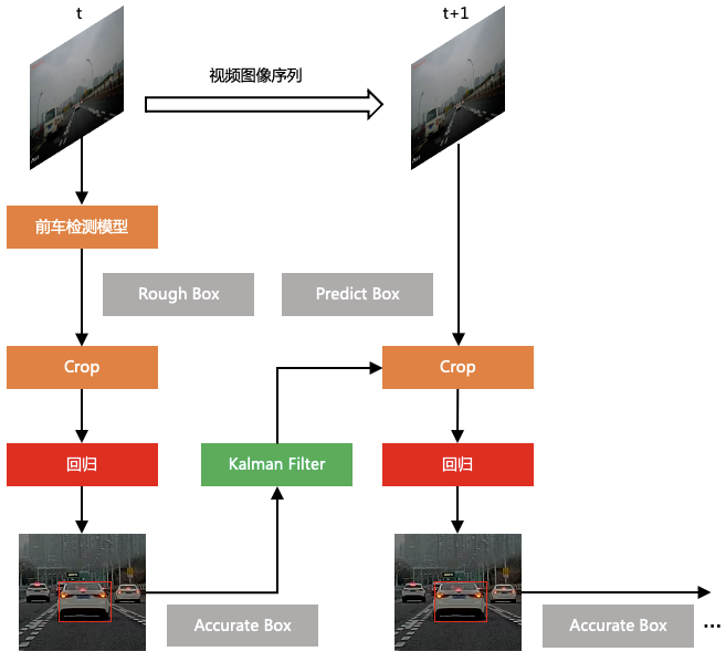 首先通过端到端的前车检测模型得出前车大致位置,再通过超轻量级的回归网络得出准确的前车包围盒。在下一时刻,利用历史检测结果对前车目标可能出现位置进行预测,在预测位置上直接进行回归。