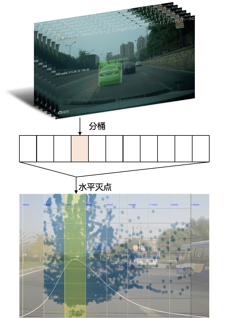 基于模型检测到的前车与本车大概率处于同一车道的先验条件,我们使用了一种简单有效的方法估计水平灭点,即通过长时间统计模型输出,分桶估计水平灭点,得到参考性的本车直行的朝向。