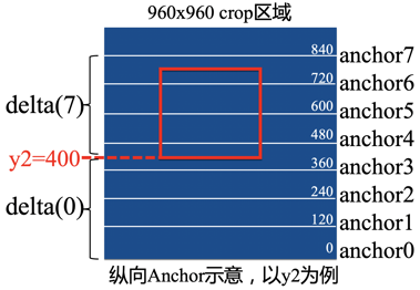 以下图中,960x960的crop区域为例,我们每隔120像素设置了一个anchor,一共8个anchor,也就是下图中的0到840。我们并不直接回归y2,而是回归y2相对于这8个anchor的偏移量delta,即