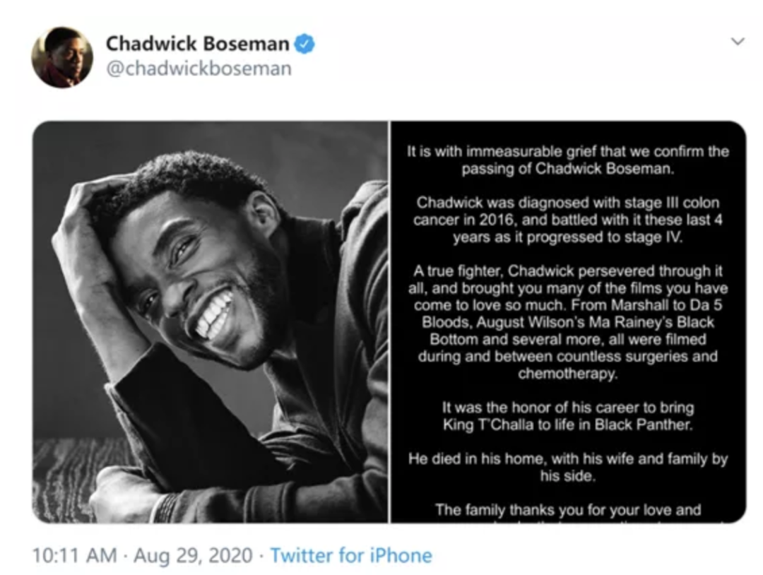 北京时间8月29日上午,经多家外媒证实,漫威电影《黑豹》男主查德维克·博斯曼因患结肠癌去世,年仅43岁。博斯曼的家人在他的推特账号上公布了这一消息:“我们怀着无限悲伤,确认查德威克·博斯曼已经去世。”