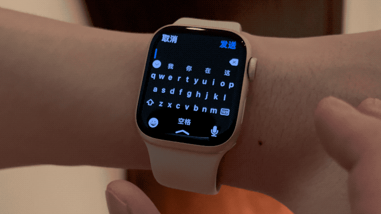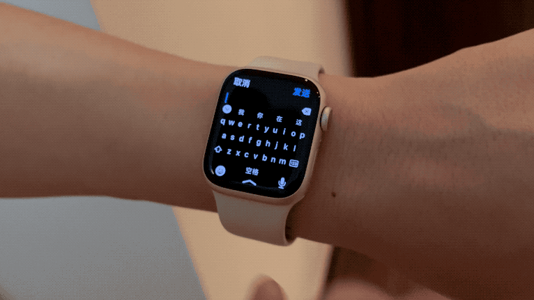 Apple Watch Series 7 的这块「全面屏」,可不仅是「大」就完事了,更大的显示空间,也让屏幕内容的可读性和操控性进一步提升。首先是可读性,屏幕更大,显示内容自然也就更多,比如在信息 App 中,新款手表一屏显示的内容就比老款手表更多;或者是在邮件 App 中,我们能够更快地获取完整邮件内容,更快地进行处理。除了显示内容更多,在许多界面中,各种应用按钮的尺寸也变大了,比如闹钟、计时器,控制中心等等;更大的按钮能够方便我们更快找到想要的那个,也是一种可读性上的提升。不用多说,更大的操作按钮,还带来了更好的操控性。比如在偶尔会用到的解锁界面,数字按钮变得更大,输入密码也会更加从容;比如在控制中心界面,不管是开关静音模式、剧院模式、飞行模式…… 都会更加方便。左:Apple Watch Series 7左:Apple Watch Series 7但是,这些更大的全面屏带来的可读性和操控性方面的提升,其实也没那么关键,毕竟在手腕上的方寸之间,手表屏幕再大,实际上也只有那么一点空间,对于体验的提升毕竟有限,而且在旧的表款上,这些操作已经没那么容易误触了。对了,不要忘记全键盘输入法。经过 7 次迭代,Apple Watch 目前已经来到第八代产品,显示屏幕也比最初大了 50% 以上。直到 Apple Watch Series 7 才有了全键盘输入法,Apple 想必是对这块全面屏和 watchOS 的软件体验相当有信心。等等,先泼一盆冷水。不得不说,从全键盘输入法的角度来看,Apple Watch Series 7 的打字体验可以用「糟糕」形容:小到难以精准定位的按键,等你一字一句打完,早就可以用手机回复不知道多少消息,更别提按键选词的过程中,还很容易误触。不过,Apple Watch 上的全键盘输入法,本来也没打算让你一个键一个键地按下输入。从 iOS 13 开始,系统输入法有了一个全新的能力:速滑输入。简而言之,这项功能可以让我们快速地在字母之间以滑动的方式选字输入,通过机器学习功能,系统能够根据输入习惯、按键频率等等行为进行微调,不需精准按下字词对应的每个字母,输入结果也能精准呈现。现在,速滑输入功能被放在了 Apple Watch Series 7 的全键盘上。体验下来,速滑输入对于按键选字的反应速度足够灵敏,识别精度也相当高,在 Apple Watch 上打字终于也能做到一气呵成。由于我本来就只会在 Apple Watch 上进行一些简单内容的回复,虽然大屏让原有的手写输入也更方便了一些,但我还是更愿意用速滑输入进行打字,毕竟一笔一画写字不仅有些麻烦,一些笔画复杂的字词也没法一下就写出来。