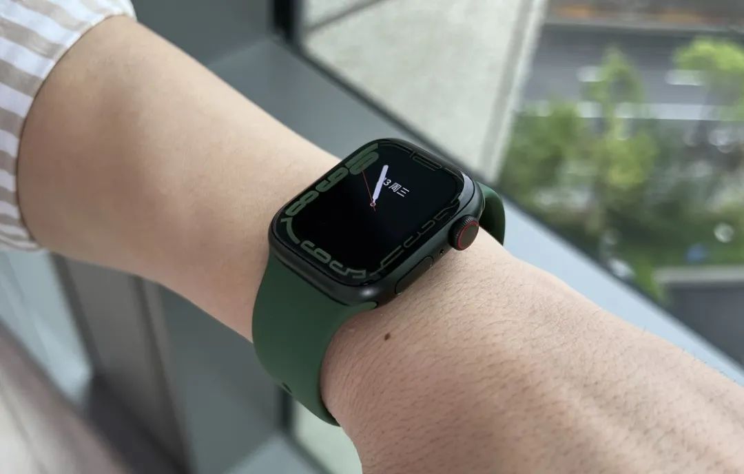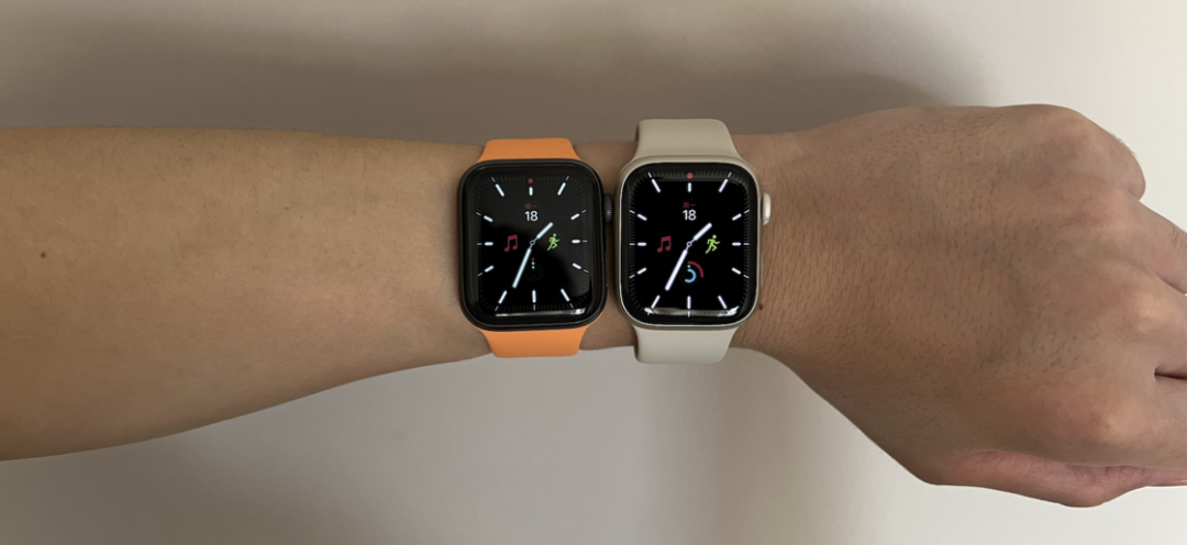 Apple Watch Series 7 是近年外观变化最大的一代产品,虽然表壳形状没有改变,远看也可能认不出是最新款的 Apple Watch,但是点亮屏幕的那一瞬间,这块显示区域更大、边框更窄的「全面屏」一定会令你印象深刻。全屏设计让 Apple Watch 有了更多显示空间的同时,也让手表整体的美观程度有了大幅度提升:延伸到表壳边缘的表盘,让整块表的设计更加浑然一体。如果在阳光下观察表盘,能够看到光线沿着显示内容的边缘游走,非常漂亮。有了更好看的屏幕,更好看的表盘肯定少不了。首先是「轮廓表盘」,这款表盘的时标围着屏幕绕成了一圈,并且会随时间流逝动态地「流动」,当前时段范围内的数字会以更大的字号进行显示。对了,除了更大的显示屏幕,厚度增加的表镜之下也有文章:利用弧形表镜边缘产生的光线反射现象,通过侧面观察,能够看到时标刻度浮在屏幕边缘,让人产生这是一块曲面显示屏的错觉。在「双模块」表盘上,时间显示区域下方能够放下 2 个复杂功能,让你一眼掌握更多信息和趋势。而在老款手表的「模块表盘」上,时间下方只能放下一个复杂功能,再往下是 3 个仅有图标、可能得想想才能明白是什么的应用按钮。双模块表盘颜色方面,不锈钢和钛金属版本的表款与之前相比没有什么变化,铝金属表款的配色则有了全新的 5 种选项,分别为午夜色、星光色、绿色、新款蓝色和红色,部分配色与 iPhone 13 以及新款 iPad mini 类似。比如午夜色表壳,仔细观察会有一种极深的蓝色的质感,结合铝金属的哑光质感,个人认为会比 iPhone 13 的午夜色更好看和更耐看。同样地,午夜色表壳在大部分情况下观感更加接近黑色,甚至比之前的深空灰色更黑,如果你喜欢黑色款式的 Apple Watch,这代产品应该不会让你失望。午夜色表壳绿色表壳颜色偏深,不仔细看的话也会有一种接近黑色的质感,虽然不像午夜色那么黑,也能比较好地融入日常搭配。绿色表壳星光色表壳则与 iPad mini 的星光色类似,相比之前的银色表壳色彩层次感更丰富,不同光线之下可能会有浅金色或者淡粉色的视觉效果。星光色表壳蓝色和红色是经过重新设计的 2 款配色。其中蓝色相比之前的版本颜色更浅更亮,有种更加轻快活泼的感觉;新款的红色给人的感觉又会更加「深沉」。红色与蓝色表壳综合来看,铝金属表壳 Apple Watch 今年推出的全新配色,每种颜色都非常有特点,相对而言也很耐看;除了蓝色和红色表壳,虽然也很好看,个人认为在搭配方面没有其它表款那么「通用」。当然,如果追求更好的质感与搭配性,不锈钢表款依然是我心中更好的选择:经过打磨之后更加闪亮的表壳,与各种表带的搭配也会更加和谐;也有人喜欢钛金属表壳同样「高级」并且更加「低调」的感觉,如果你拿不准,不妨去线下 Apple Store 上手试试。不锈钢表壳钛金属表壳
