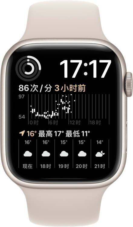 今年 Apple Watch Series 7 再次提高了常亮显示 (Always-On display) 的屏幕亮度,根据官网介绍,即使当手腕下垂时,屏幕亮度在室内条件下也有 70% 的提升。实际对比来看,新款 Apple Watch 的息屏显示亮度确实比老款有提升,通过表盘指针、刻度,应用图标的色彩等方面都能看出来。虽然从我的使用场景来说,日常佩戴 Apple Watch 时的息屏显示亮度已经足够亮了,几乎没有不抬手看不清时间的情况,但是这项特性的加入,确实也让这块屏幕的观感变得更「讨喜」了,尤其是在色彩方面。不要忘了,Apple Watch 的屏幕也变大了,这些屏幕上的新特性,加上 watchOS 系统带来的新功能,毫无疑问都会导致功耗提升。好在,Apple Watch Series 7 的续航水平继续与老款手表保持一致,官方公布的全天续航时长依然长达 18 小时,可以看出 Apple 不论是在硬件还是在软件方面都对功耗优化下了不少功夫。实际上,如果你阅读了新款 Apple Watch 的参数规格,就会发现一个有趣的细节:Apple Watch Series 7 配备的是一枚 64 位双核 S7 芯片,速度最快比配备 S5 芯片的 Apple Watch SE 快了 20%;而 Apple Watch Series 6 配备的 S6 芯片的运行速度,根据此前给出的数据,同样比 S5 芯片最快提升 20%,似乎间接证明了 Apple Watch Series 7 在性能方面与 Apple Watch Series 6 相比没有提升。因此,不难猜测,这枚 S7 芯片的主要升级应该就是在功耗方面,才让 Apple Watch Series 7 继续拥有全天可用的续航水平。说是全天续航,从我个人的使用情况来看,续航能力其实还要更好。早上洗漱之后戴上 Apple Watch,白天正常收发手机通知、处理一些简单事务,比如在手表上查看、添加待办事项、回复信息等等;Apple Watch 还要全天监测我的各项身体数据,比如心率、步数、运动状态、能量消耗等等,到了晚上还剩 50% 的电量,也是经常的事。由此可见,虽然 Apple Watch 的续航时长还是没有突破「一天」大关,但是作为日常用表,在多数情况下也完全不会引起「电量焦虑」。即便如此,还是有不少人觉得一块手表也得一天一充是件非常麻烦的事,Apple Watch 比起一些同类型的可穿戴设备续航水平确实也不算好。所以,Apple 从另一方面在一定程度上弥补了这项不足,那就是充电速度。根据官方说明,Apple Watch Series 7 的充电系统架构经过升级,搭配 USB-C 快速充电线,把电量从零充到 80% 仅需约 45 分钟,速度比 Apple Watch Series 6 快了 33%。实际测试来看,使用 Apple 官网在售的 mophie 三合一无线充电底座为快没电的 Apple Watch充电,一小时还充不满 50%;使用新款 Apple Watch 随附的 USB-C 充电线进行充电,仅 40 分钟电量就从 38% 充到 96%,速度确实快了不少。