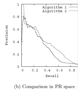 以精确率为y轴,以召回率为x轴,我们就得到了PR曲线。仍然从精确率和召回率的定义可以理解,精确率越高,召回率越高,我们的模型和算法就越高效。也就是画出来的PR曲线越靠近右上越好。如上图右图所示。使用RoC曲线和PR曲线,我们就能很方便的评估我们的模型的分类能力的优劣了。