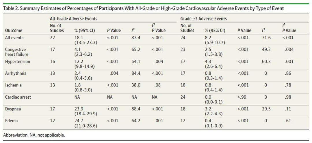 总体心血管不良事件CVAE发生率为0%-52%,>=3级CVAE发生率为0%-45%。采用随机效应模型进行META分析合并数据后,所有级别CVAE发生率和>=3级CVAE发生率分别为18.1%和8.2%。