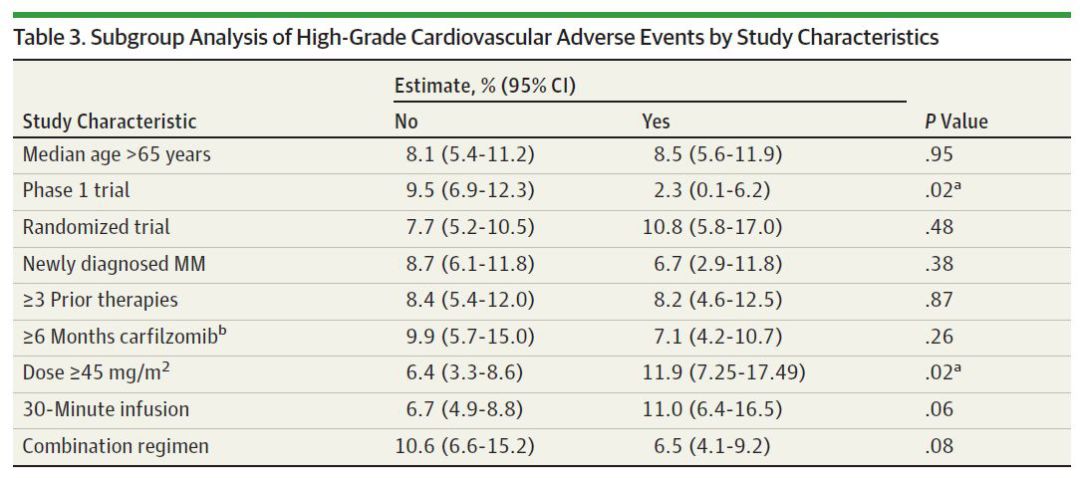 表 3 按研究特征对高等级心血管不良事件进行亚组分析