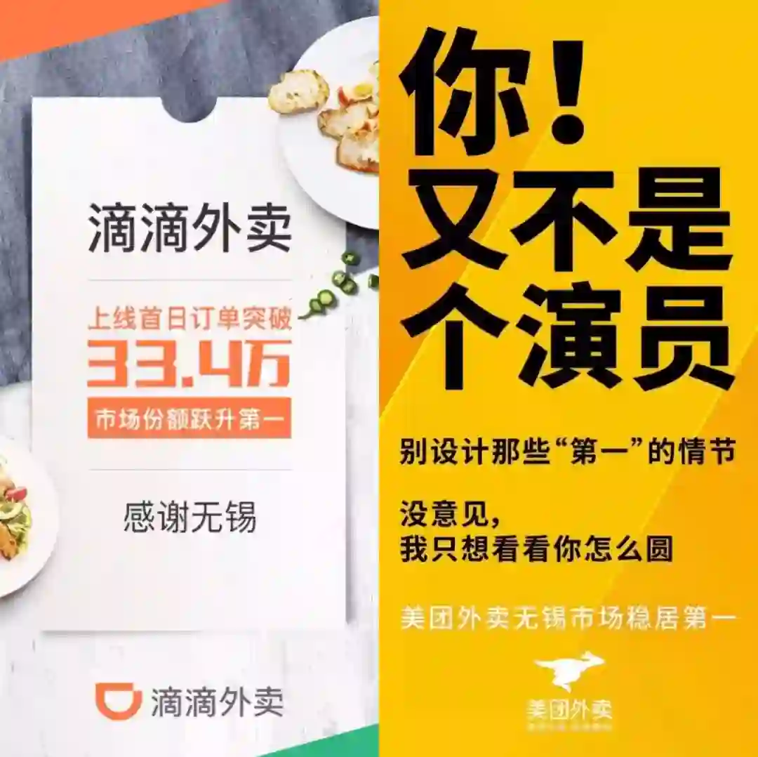 针对该消息,昨天下午美团外卖发布了回击滴滴外卖的海报,海报内容中写道「你!又不是个演员,别设计那些「第一」的情节。没意见,我只想看看你怎么圆」并称美团外卖在无锡市场稳居第一。(来源:新浪科技)