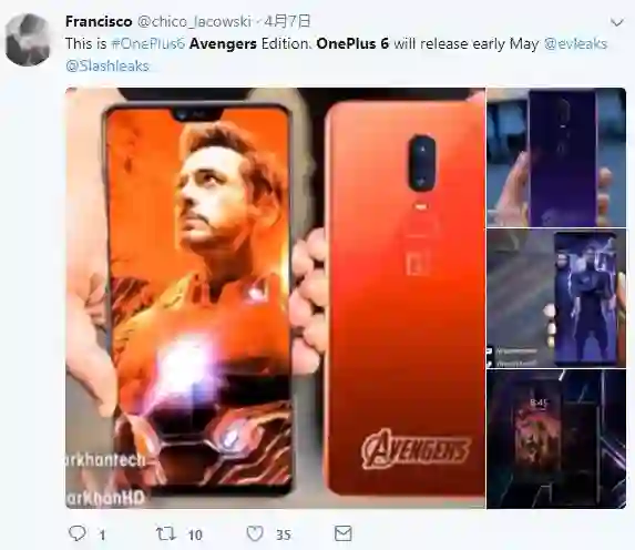 近日,Twitter 网友曝光了一加 6 复仇者联盟定制版手机,可能有红、紫两种配色,机身将采用渐变色和「异形全面屏」的设计。据外媒报道称,特别版一加 6 将限量发售,并成为漫威即将上映的电影《复仇者联盟:无限战争》广告活动的一部分。