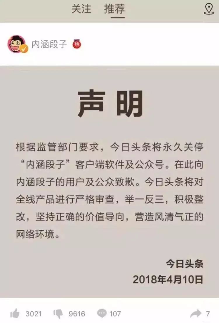 昨日今日头条母公司表示,根据监管部门要求,将永久关停「内涵段子」应用及公众号,并向「内涵段子」的用户及公众致歉,并将对全线产品进行严格审查。同时,今日头条也在 App Store 被下架。