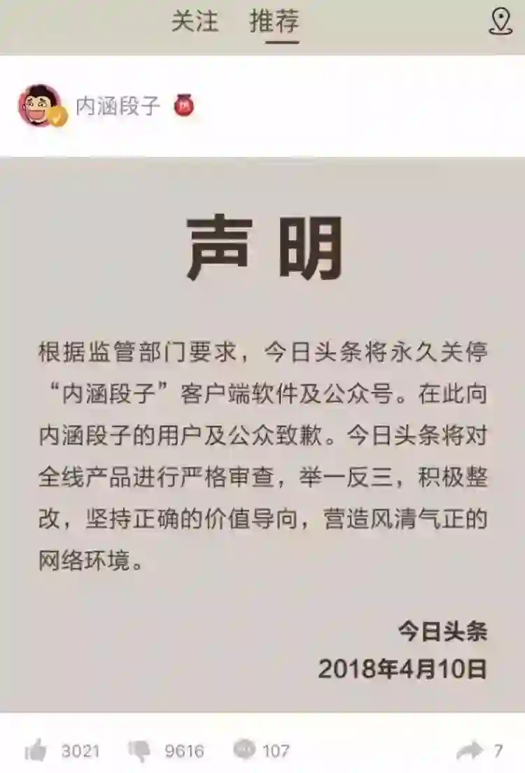此举源于昨日国家广播电视总局在其微信公众号上表示,在督察「今日头条」网站整改工作中,发现该公司组织推送的「内涵段子」存在导向不正、格调低俗等突出问题,引发网民强烈反感。总局责令「今日头条」永久关停「内涵段子」应用及公众号,并要求该公司举一反三,全面清理类似视听节目产品。