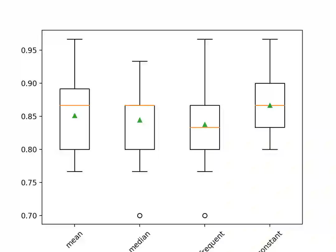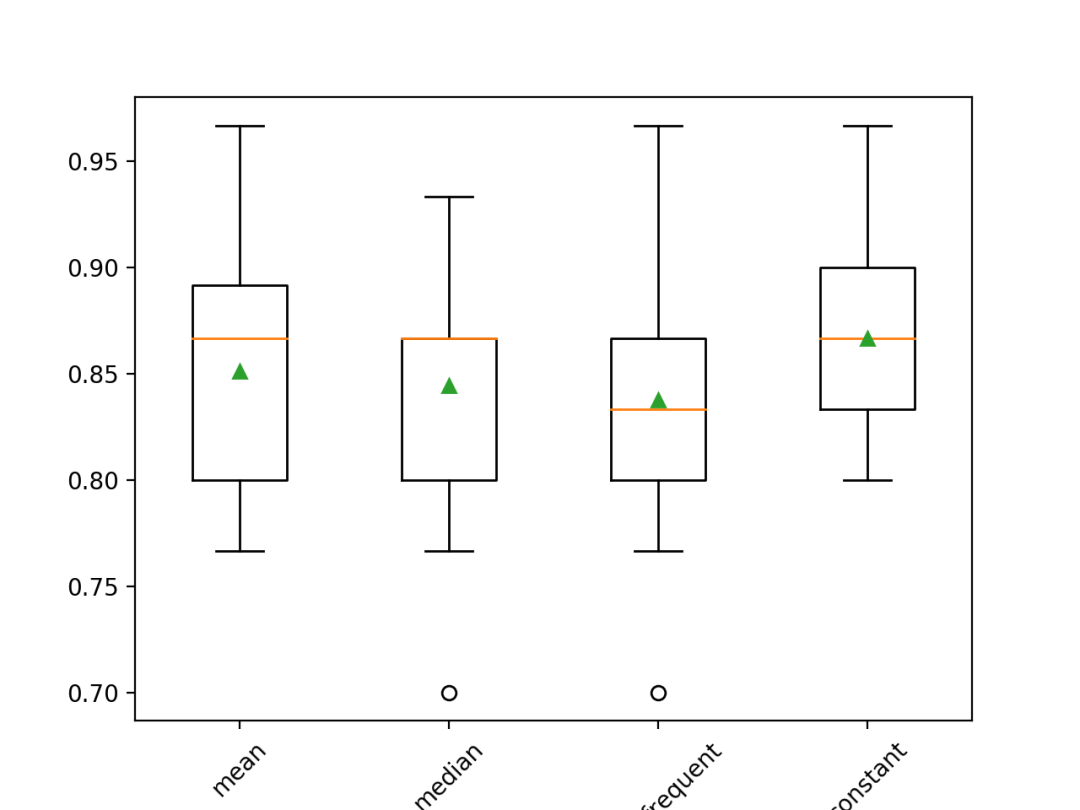 # compare statistical imputation strategies for the horse colic datasetfrom numpy import meanfrom numpy import stdfrom pandas import read_csvfrom sklearn.ensemble import RandomForestClassifierfrom sklearn.impute import SimpleImputerfrom sklearn.model_selection import cross_val_scorefrom sklearn.model_selection import RepeatedStratifiedKFoldfrom sklearn.pipeline import Pipelinefrom matplotlib import pyplot# load dataseturl = 'https://raw.githubusercontent.com/jbrownlee/Datasets/master/horse-colic.csv'dataframe = read_csv(url, header=None, na_values='?')# split into input and output elementsdata = dataframe.valuesX, y = data[:, :-1], data[:, -1]# evaluate each strategy on the datasetresults = list()strategies = ['mean', 'median', 'most_frequent', 'constant']for s in strategies:# create the modeling pipelinepipeline = Pipeline(steps=[('i', SimpleImputer(strategy=s)), ('m', RandomForestClassifier())])# evaluate the modelcv = RepeatedStratifiedKFold(n_splits=10, n_repeats=3, random_state=1)scores = cross_val_score(pipeline, X, y, scoring='accuracy', cv=cv, n_jobs=-1)# store resultsresults.append(scores)print('>%s %.3f (%.3f)' % (s, mean(scores), std(scores)))# plot model performance for comparisonpyplot.boxplot(results, labels=strategies, showmeans=True)pyplot.xticks(rotation=45)pyplot.show()