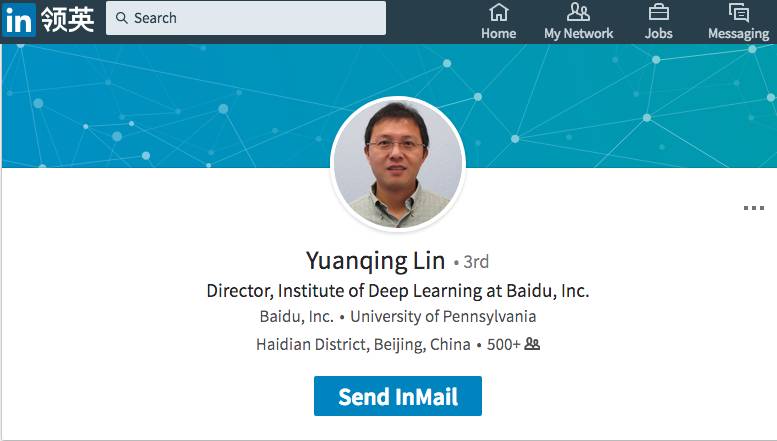 大数据文摘查看发现,林元庆的领英界面还未更新,仍显示他为百度深度学习实验室(IDL)主任。