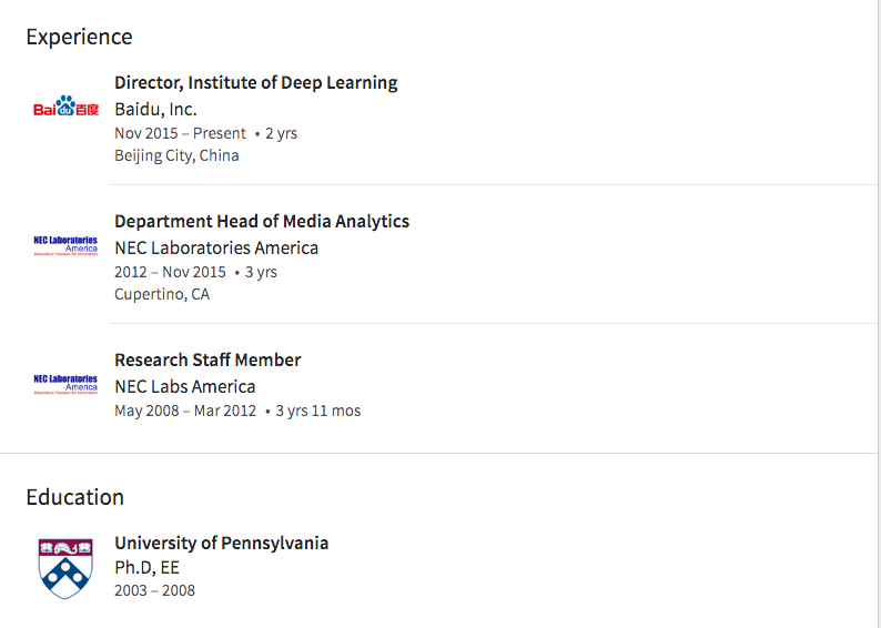 百度历任职位:深度学习实验室(IDL)主任,百度研究院院长(2017年3月)