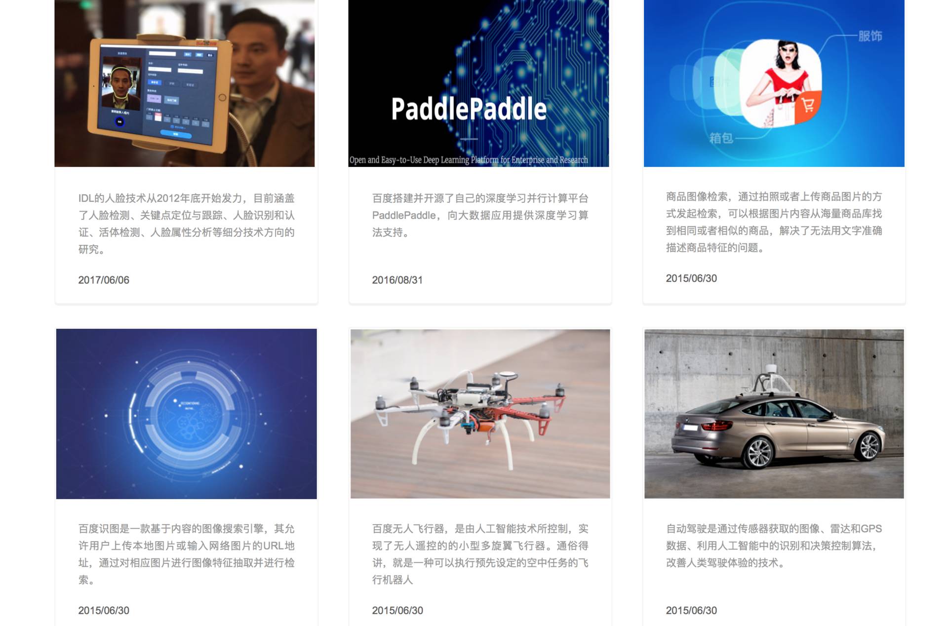 图:百度深度学习实验室(IDL)官网显示的研究方向(其中仅人脸技术方向更新于今年6月,其他的更新均为1-2年前)