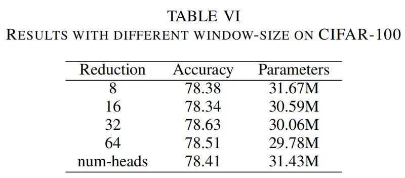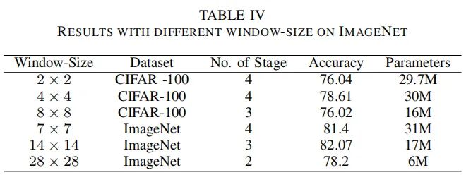 Local-Transformer的序列长度是影响计算成本的重要因素之一。随着序列长度的增加,自注意力机制的计算量也随之增加。在局部可视化Transformer中,序列长度取决于Window-size。在计算精度和计算成本之间总是要根据序列长度进行权衡。作者在模型中实验各种window size,发现4 x4和14 x14 window size适用cifar-100和ImageNet数据集,分别如表4所示。此外,删除window size大于的阶段特征图大小显著降低参数的数量。