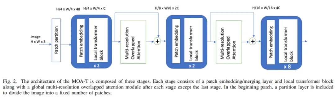 本文的目标是通过增加最小的计算成本和参数,在Local Transformer的所有Window中提供全局信息交换。图2显示了提出的模型的概述,其中显示了每个阶段后的MOA模块。各阶段结构设计相似,除第一阶段外,其余阶段均包括Patch Merge层和Local Transformer Block。第一阶段由Patch Partition、Linear Embedding Layer和Local Transformer Block组成。