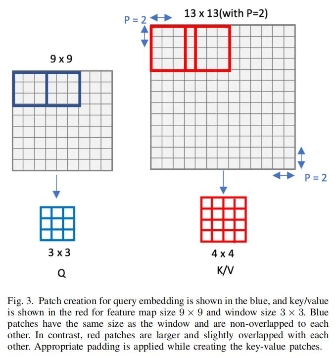 因此,首先利用1×1卷积来减少具有因子R的隐藏层维数,从而降低了计算成本。应用卷积后的特征维数为H×W×hiddendim/R。在一个query patch中特征大小为14×14×R被投影到一维向量的大小1×1×R。query的总数为H/14×W/14。类似地,投影key和value向量,但patch size略大于query,如图3所示。