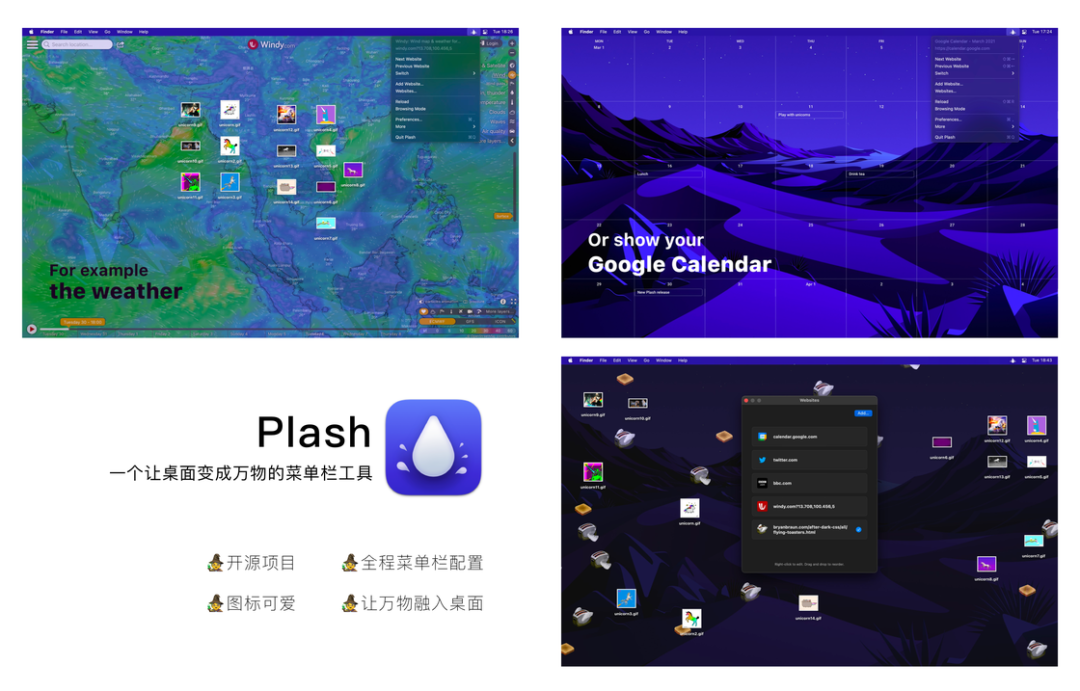 Plash 是一款开源应用,应用图标本身就很可爱,小小的水滴状💧,特别像动森里幽幽每次受惊吓之后飞散的「小幽幽」。但是,可不要小看这个水滴,这款应用可以说是万能的,不管你想要效率还是可爱类的桌面展示,Plash 都可以轻松帮你完成。