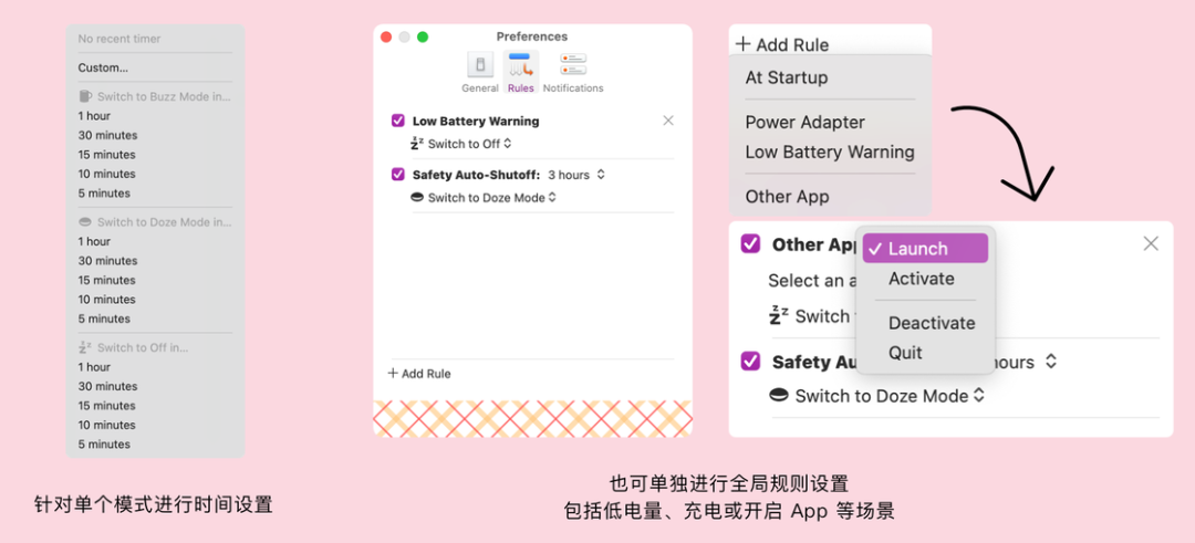 同时,软件也支持最基本的自定义时间设置,即可通过「Set Timer」进行各个模式的时间设置。当然如果你不喜欢这种具体时间的设置,也可以在设置里进行全局规则的自定义。比如在低电量时开启「Off 模式」,或者也可以添加「当某个指定 App 开启/退出时」切换为三个模式中的任意一个,很是方便。