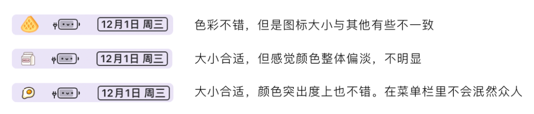 正常情况下我会一次性挑选出 4-5 个心仪的图标,下载下来后再放到 Bartender 里进行实际适配。这里的适配主要是指换上该图标后与整个菜单栏看起来不违和。因为有的图片单看可能很好看,但是放到菜单栏当图标时,可能因为尺寸大小或者颜色饱和度等问题,而造成整体视觉效果不佳。所以多点选择总没错。
