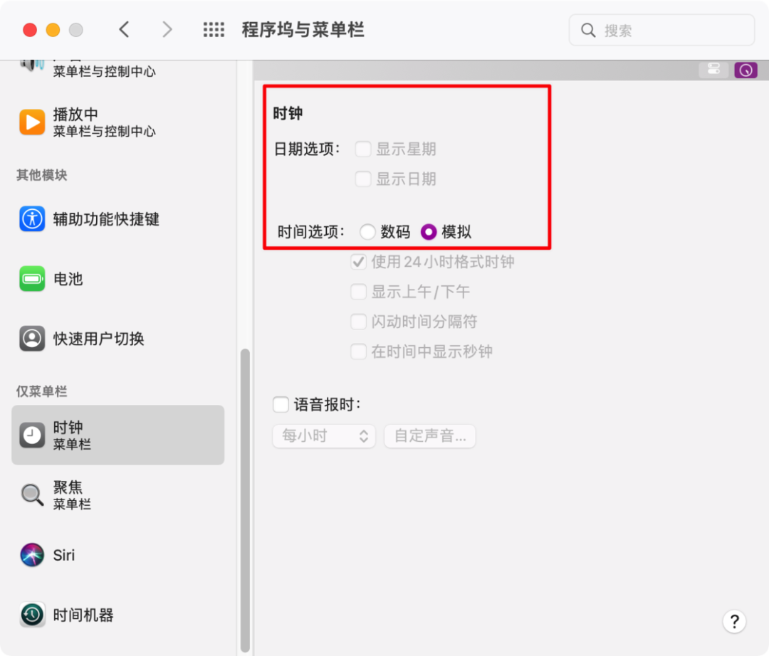 :如果决定使用 Itsycal 作为菜单栏日历显示后,记得把系统自带的日期显示调成最简模式。因为系统自带日期在菜单栏无法选择「完全消失」,并且在 Bartender 的加持下,也无法隐藏。所以建议大家把它调成模拟表盘模式,让其以最小的占地面积出现在菜单栏。
