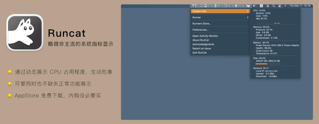 正所谓,有的图标看起来很可爱,但不一定这个应用就很可爱,比如 Runcat。作为一个类似于 iStat Menus 状态栏监控指标的 Runcat,也有各种 CPU、GPU 等数据指标的展示,但这个不是最重要的。
