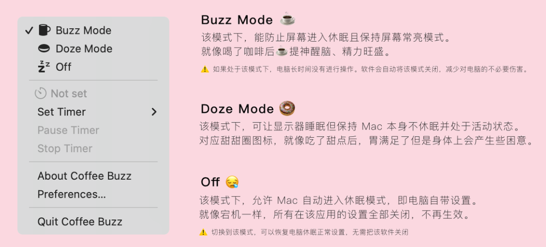 Coffee Buzz 是一款 macOS 平台对 Mac 休眠进行多模式设置的软件,通过 Coffee Buzz 能够快速一键化设置电脑「需要怎样」进入休眠状态。或许听起来很绕口,但结合图标看看就清晰了然了。
