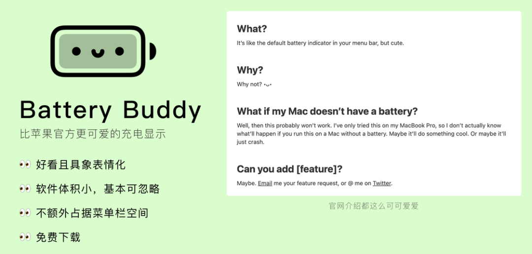 目前应用内会通过上述 7 种表情来展示不同电量下的状态,只要保持让笑脸常在,就不用担心电脑没电啦~应用安装完毕后基本就不需要什么额外操作,只需要没事 check 下小电池图标就好啦。