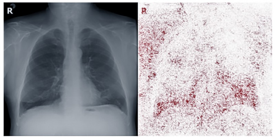 帮助DeGrave和Janizek确定胸部 X 射线图片上的方向标记(字母R)影响诊断的一种工具是显着性图(Saliency Map),这是一种用颜色编码的图表,显示计算机在推断时最关注图像的哪一部分。如图2所示。