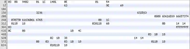 以十六进制查看文件可显示文件头部的值,这些值描述了字符串池及其它值,例如0x9402是文件的大小。字符串也具有一种有意思的编码。如果字段超出了 8 个字节,它们的总长度将在随后的两个字节中指定。