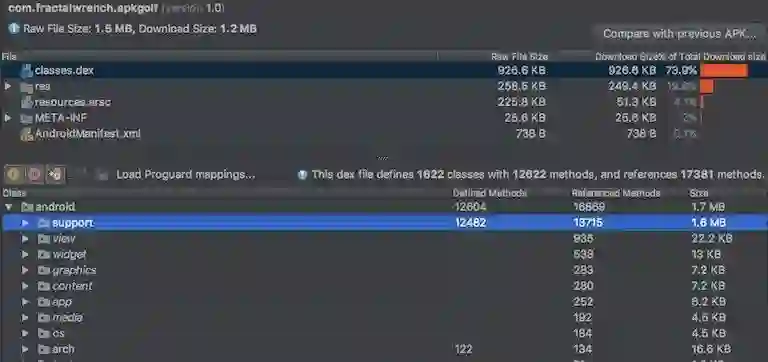 看上去罪魁祸首是classes.dex文件,它占据了 73% 的空间,因而它成为我们的首要削减目标。该文件为 Dex 格式