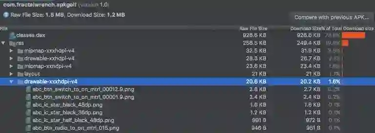 目录“res”现在占用 APK 规模约 95%,原因是所有的加载图标。如果这些 PNG 图片是由我们自己的设计师所给出的,那么我们可以尝试 将它们转换为 WebP 格式,该格式更加高效,并被 API 15 及以上所支持。