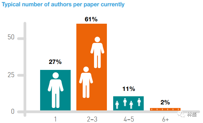 有56%的受访者认为,现在的合著频次比他们研究生涯开始时更加频繁,在他们研究生涯的早期阶段,约有50%的论文只有一个作者,而这一数字现在下降到27%,一篇论文拥有两位至三位作者是现在最普遍的情况。