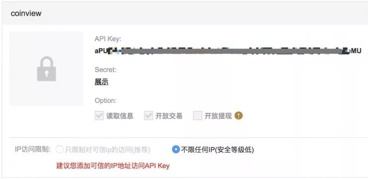 从币安 API Key 的权限默认设置中也可以看出些细节。首先,在默认权限设置中并不限制任何 IP 的访问,但也提醒了用户安全等级较低的问题。另外,币安并未将开放提现设置为默认选项,但有些用户为了操作方便既没有限制IP,甚至打开了取款提现选项。
