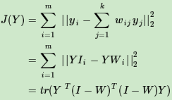 如果令M=(I−W)^T(I−W),则优化函数转变为最小化下式:J(Y)=tr(Y^TMY),tr为迹函数。约束函数矩阵化为: